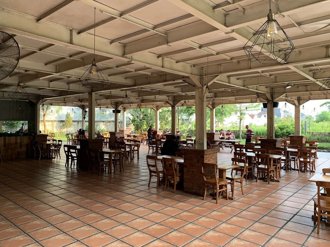 Suasana taman hijau terbuka, pilihan makanan beragam, cocok nongkrong bareng teman.